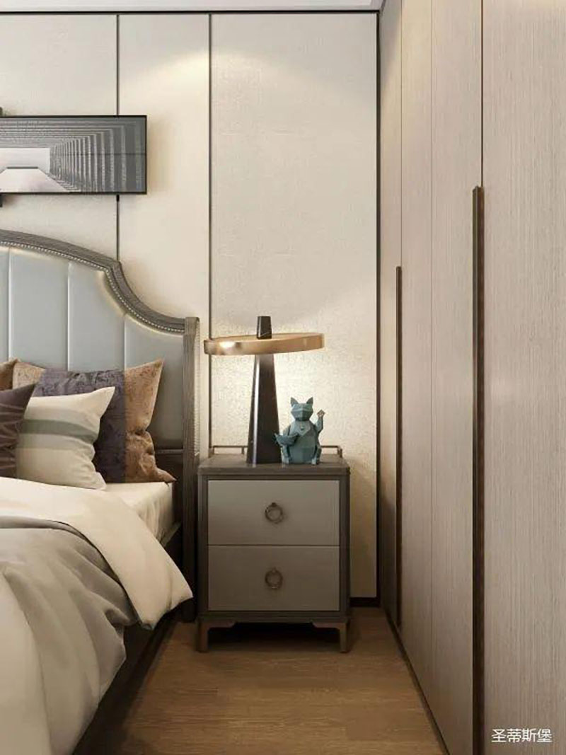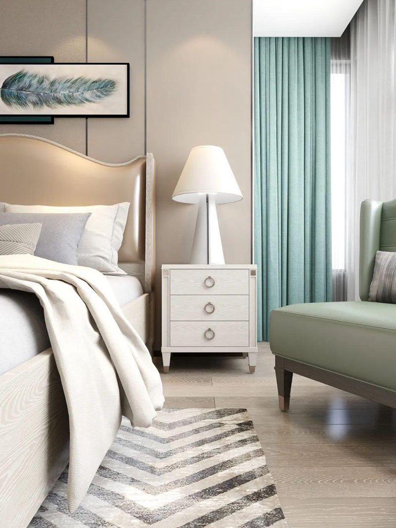 ▲次卧空间主要是以浅色为底调,大面积的莫兰迪色与浅色相平衡。极强线性装饰画带来的延伸感让视觉焕然一新。少许的金属元素摄入,瞬间提升了空间的精致度,将温润雅致与时尚轻奢糅合在同一空间里,每一处都洋溢着浪漫的气息。