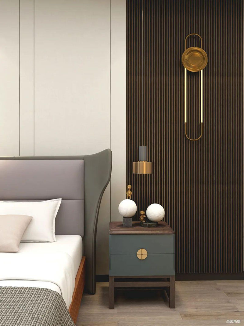 卧室精简有致,从质感出发,打造由内而外的优雅奢华感。背景墙、地板、地毯均拥有较强的肌理感,在加上金属软装饰物调和,让空间在低调内敛的基础上又不失时尚的高级感,飘窗进阶为温馨的一角,闲暇时,则可倚窗而坐,品一杯红酒,感受生活中的惬意时光。