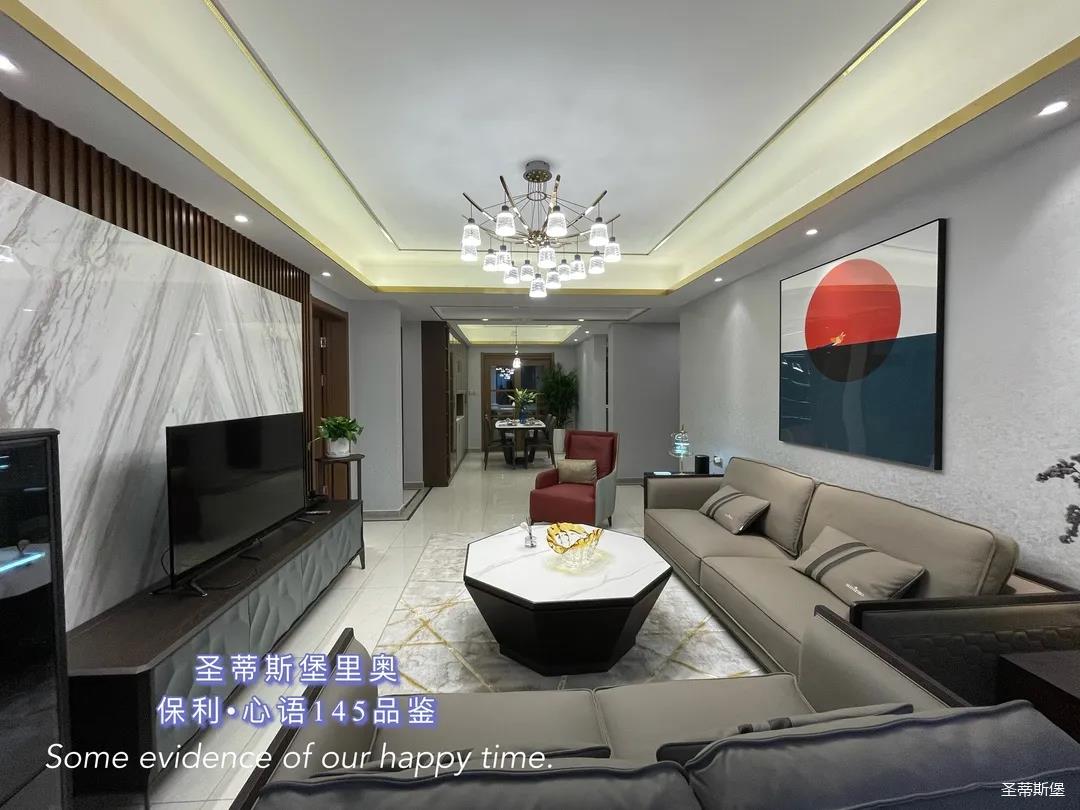 ▲客厅以灰色为主调,电视背景墙采用拼接大理石搭配实木阑珊,与对立墙面形成撞色处理,既可以加深空间层次感,也提升了空间明亮度。一字型真皮沙发与实木电视柜中和了大空间的空旷,打造出一个谈心叙话的和谐空间。
