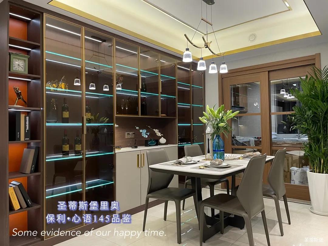 ▲餐厅一面及顶的透明柜体,以简练的金属线条分割出收纳空间,让立面视觉更显精致干净。餐边柜设置了台面、全玻璃展示区以及隐藏收纳区,满足了日常生活中多样的收纳需求。
