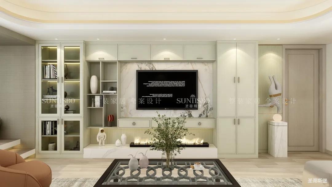 电视墙在客厅除了承担着整体美观之外,在小户型的收纳上也能承担一些其他功能,比如小户型收纳问题。如果你家有强烈收纳需求,可以选择定制柜体墙面,做成整墙收纳柜体,安装无拉手柜面,既满足了日常收纳需求,也融合了美观的装饰效果。